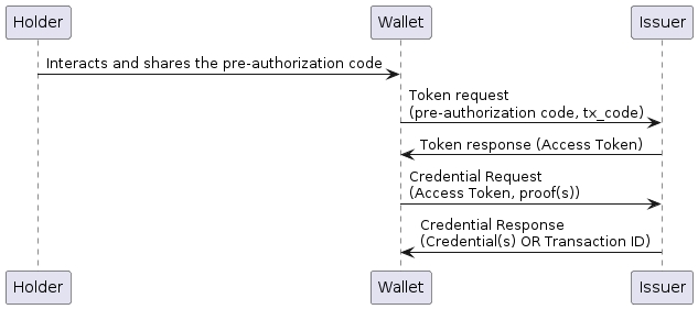 This workflow follows the pre-authorization code flow of the OAuth 2.0 authorization framework. Before interacting with the Wallet, the Credential Issuer generates a Verifiable Credential for the Holder and provides a pre-authorization code. The Holder uses this pre-authorization code to obtain the Credentials in the Wallet which is shared as part of the token endpoint to receive an access token, which is then used to retrieve the credentials.