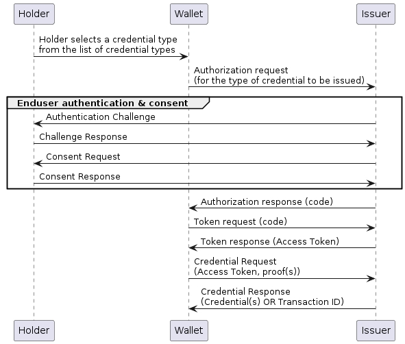 In this workflow, the Holder initiates the request using the Wallet and authenticates via the Issuer's authorization endpoint. Once authentication is completed and consent is given, the Issuer provides an authorization code specified in RFC6749 to issue access tokens. The Wallet can then use the access token to retrieve the credential from the Issuer by calling the credential issuance endpoint.